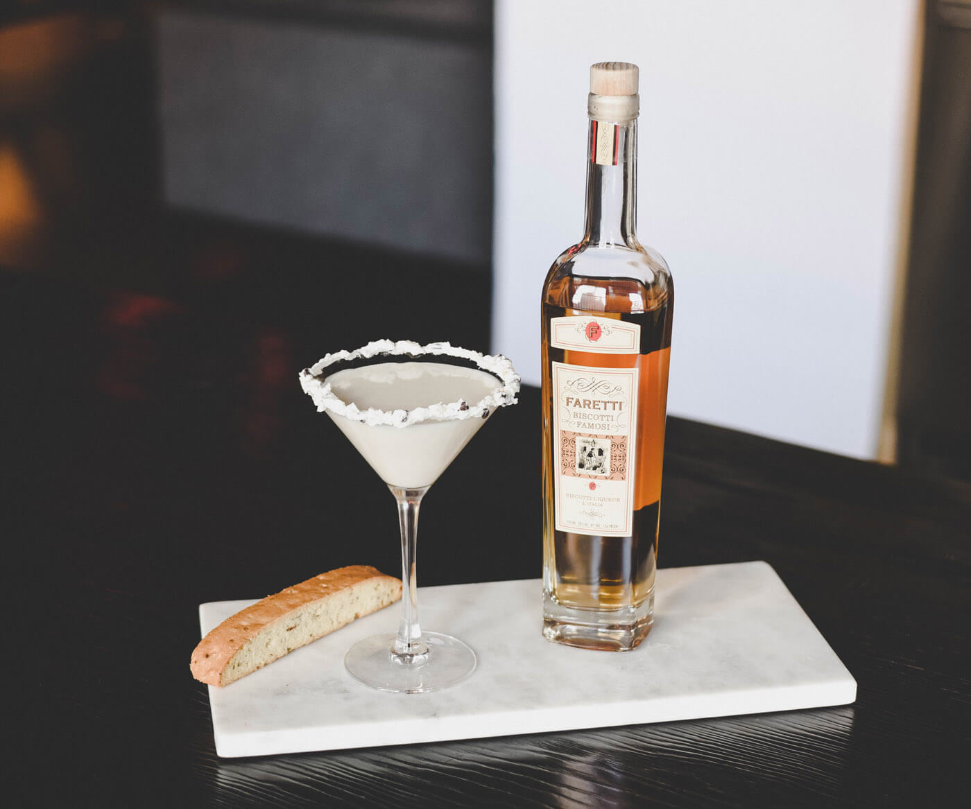 Served in a martini glass with a crushed cannoli rim and a biscotti cookie.